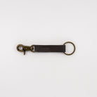 Compact and versatile handmade leather keychain crafted from upcycled materials. Features a dark brown pattern and a durable brass clip for secure attachment to keys, bags, or ID tags. Made in Canada with sustainably-sourced remnant leather. Measures 5 inches.